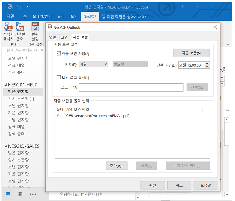 - 폴더 내의 전자 메일을 PDF 형식으로 변환하여 보관하고 보관 빈도와 시간을 사용자 지정할 수 있습니다.